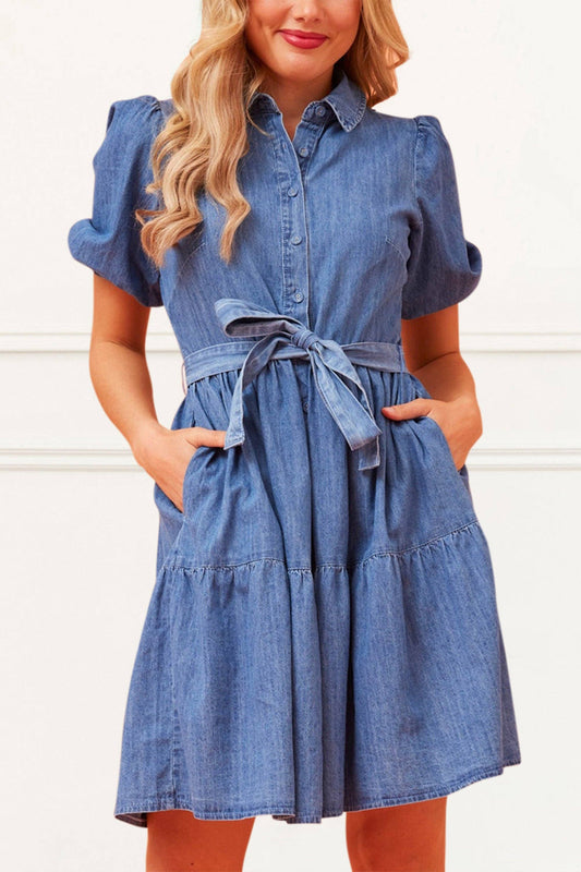 Bella Denim Tiered Shirt Dress Short Sleeves Belt