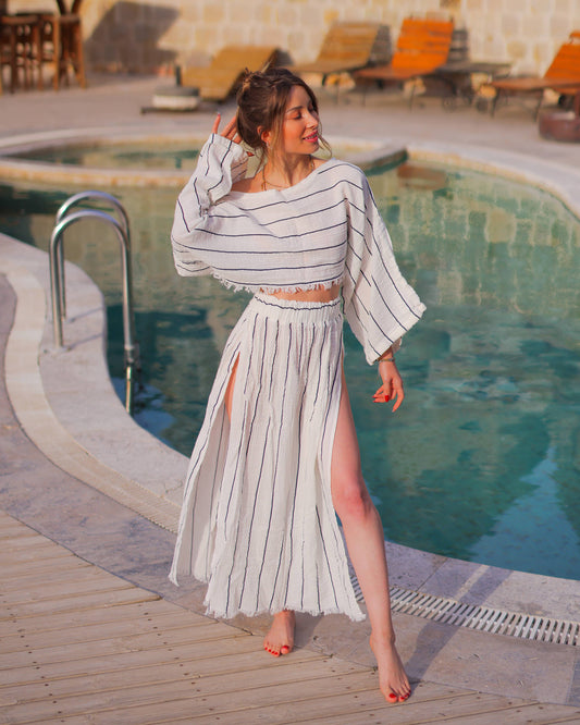 Black Striped Side Slit Cotton Maxi Skirt