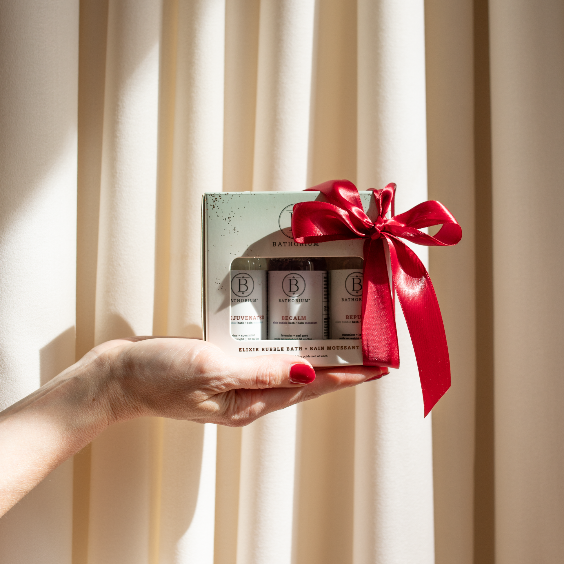 A mini trio gift set of our bestselling Bubble Bath Elixirs—BeCalm, BeRejuvenated, and BePure—this giftable set is perfect for any bath lover.