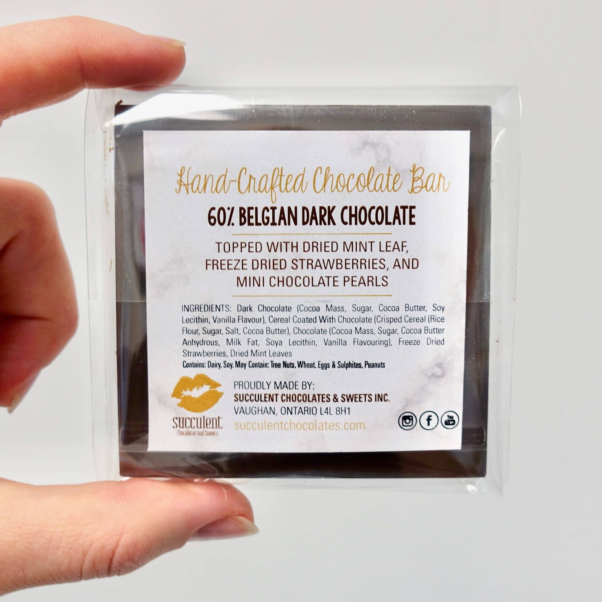 A decedent 60% Belgian dark chocolate bar topped with Freeze Dried Strawberries, Dried Mint Leaves and Mini Chocolate Pearls